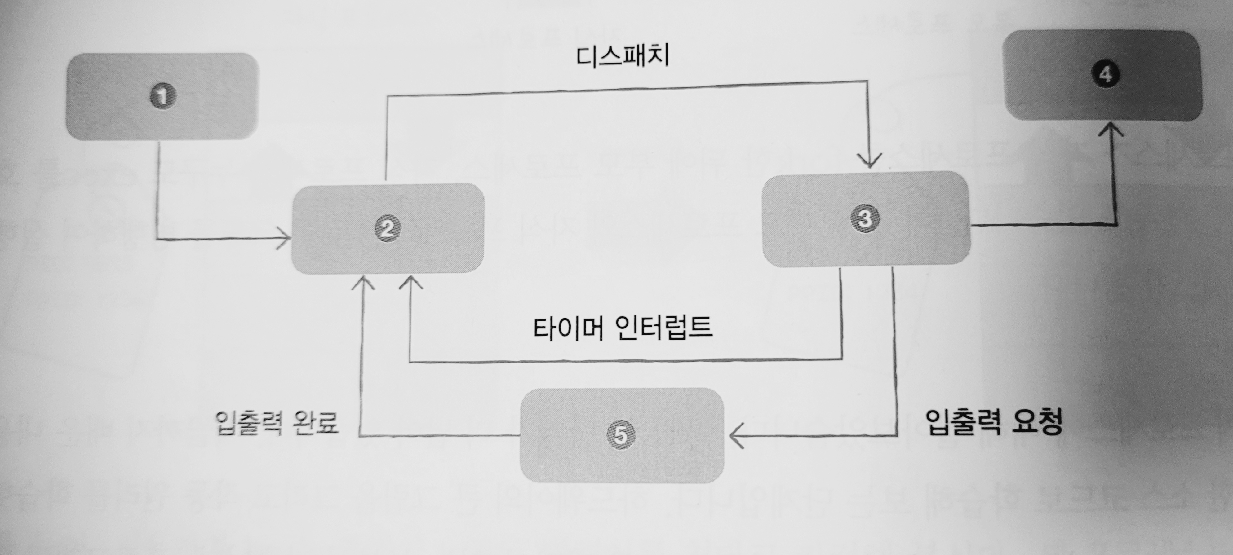 프로세스가 할당된 시간을 모두 사용(타이머 인터럽트)하면 다시 준비 상태가 되고, 실행 도중 입출력장치가 사용되면 대기 상태가 된다
