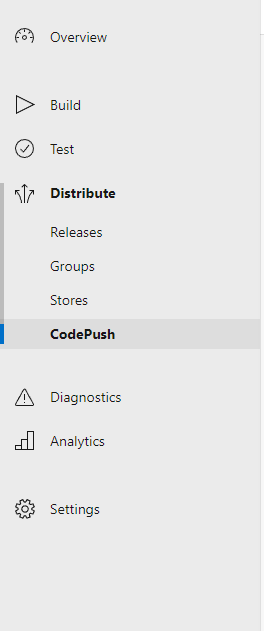 App Center에서 각 앱의 대시보드에 들어간 후,아래와 같은 좌측 바에서 CodePush로 접속하면 된다.