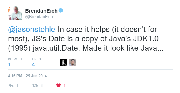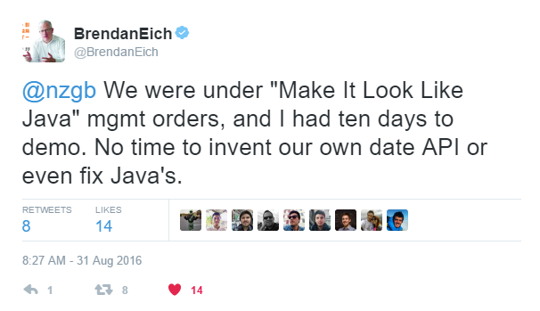 브랜든 아이크: JS의 Date는 Java JDK 1.0의 java.util.Date의 복사본이다. Java와 비슷하게 만들고자 했다...우리는 "Java처럼 보이게 만들기"라는 관리자의 주문을 받았고, 데모를 만들 때까지는 열흘이 남아 있었다. 우리 고유의 Date API를 만들거나 Java의 것을 고칠 시간조차 없었던 것이다.