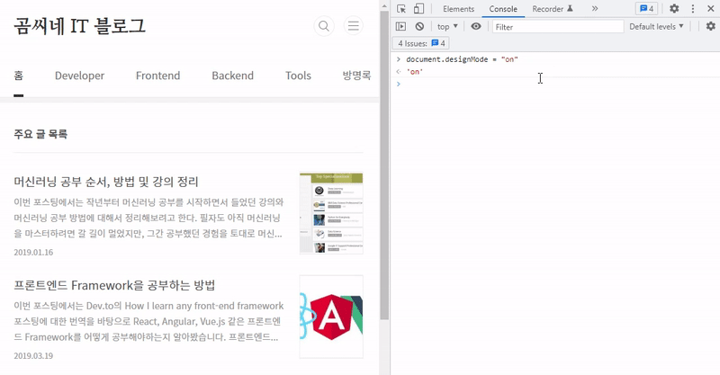 웹 브라우저에서 임시로 화면을 수정하는 기능을 말한다. Devtool에서 직접 코드를 수정하지 않고도 화면에 있는 텍스트를 바꾸거나 이미지를 옮겨보는 작업을 할 수 있다. 디자인 모드를 적용하면 빠르게 웹 화면을 조정할 수 있고, 손쉽게 각 구성 요소의 배치를 최적화할 수 있다.
